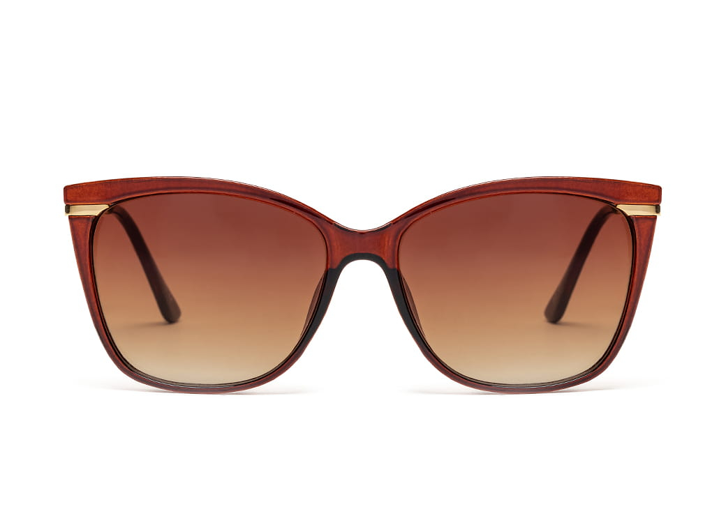 Okulary przeciwsłoneczne o kształcie "kocie oko" w kolorze brązowym.Delikatny,metalowy zausznik.