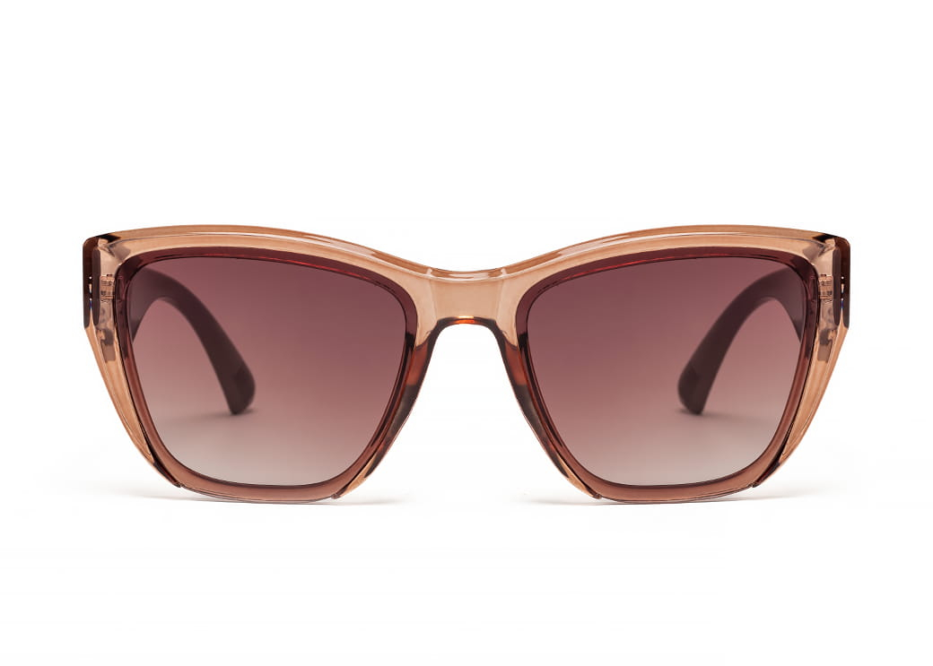 Klasyczne okulary przeciwsłoneczne z polaryzacją w kolorze jasnobeżowym z ciemnym, delikatnie zdobionym zausznikiem.