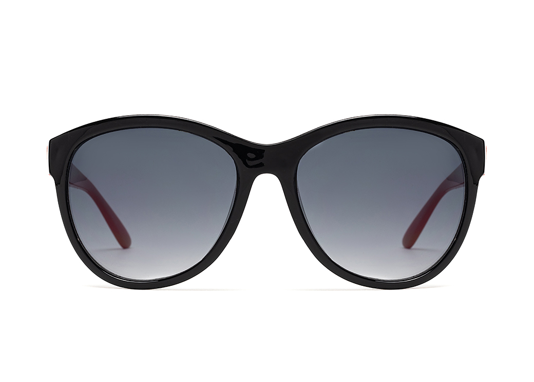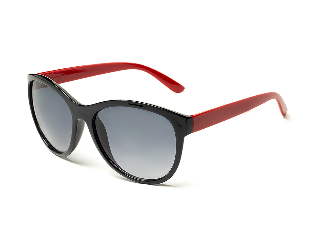 Okulary przeciwsłoneczne o kształcie "kocie oko" w kolorze czarnym,zausznik w kolorze czerwonym.