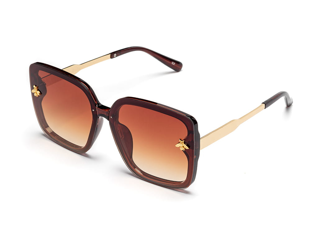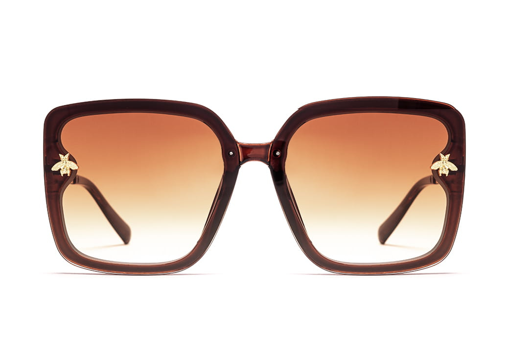 Duże,kwadratowe okulary przeciwsłoneczne w kolorze brązowym.Gustowne zdobienie na froncie oprawki, metalowy zausznik.