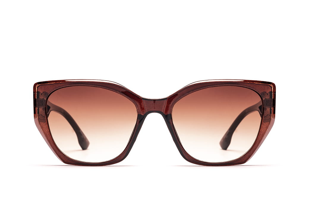 Okulary przeciwsłoneczne w kolorze brązowym o ciekawym, geometrycznym kształcie.Eleganckie zdobienie na zauszniku.