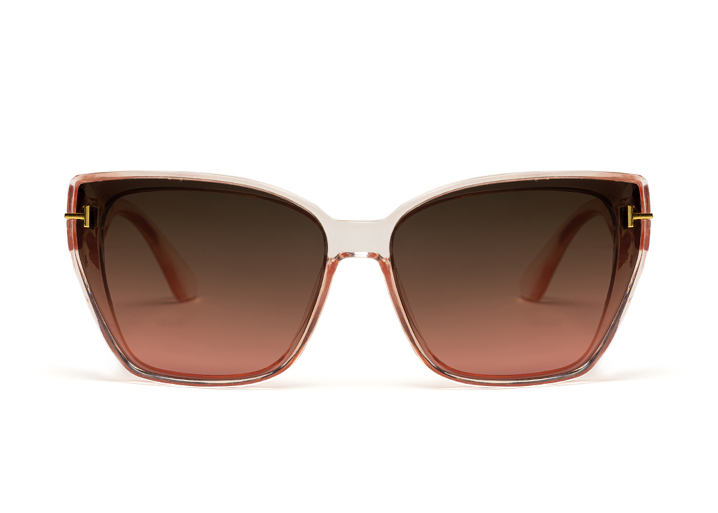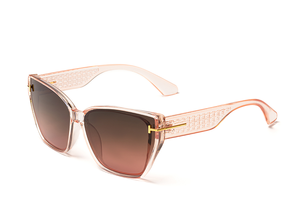 Klasyczne okulary przeciwsłoneczne w kolorze jasny róż z delikatnym zdobieniem.