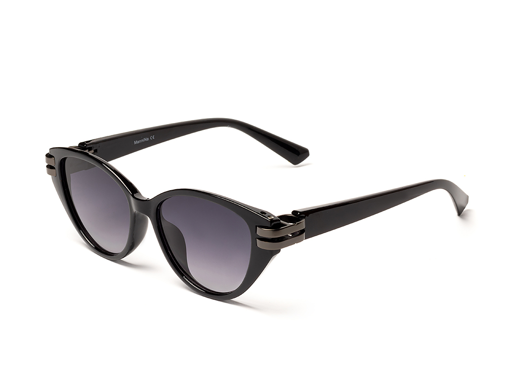 Oryginalne okulary przeciwsłonecznym w kolorze czarnym o kształcie "kocie oko".Metalowy element ozdobny łączący front oprawki z zausznikiem.