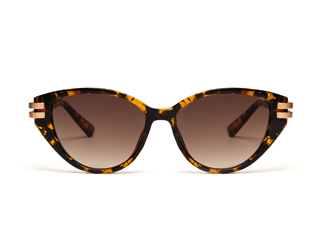 Oryginalne okulary przeciwsłonecznym w kolorze brąz panterka o kształcie "kocie oko".Metalowy element ozdobny łączący front oprawki z zausznikiem.