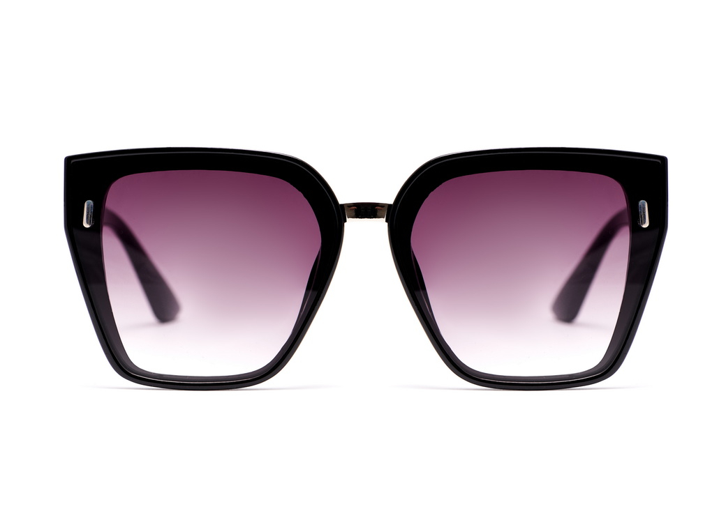 Duże,klasyczne okulary przeciwsłoneczne w kolorze czarnym.Lekkie zdobienie na froncie oprawki.