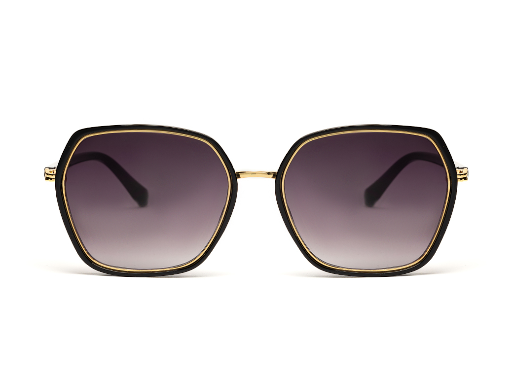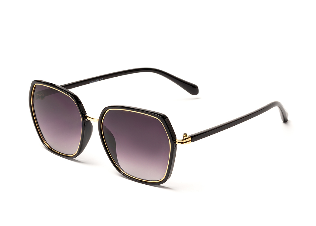 Okulary przeciwsłoneczne o geometrycznym kształcie w kolorze czarnym.Lekkie zdobienie wokół frontu oprawki.