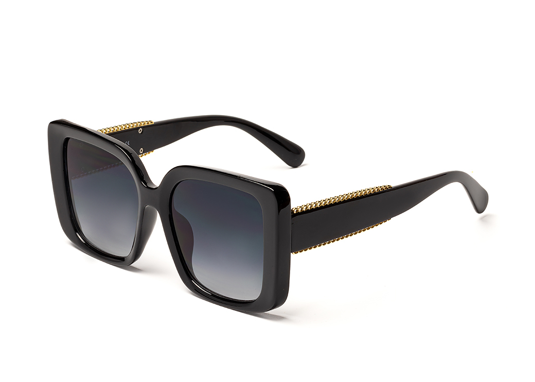 Duże klasyczne okulary przeciwsłoneczne w kolorze czarnym.Elegancki metalowy motyw na zauszniku.