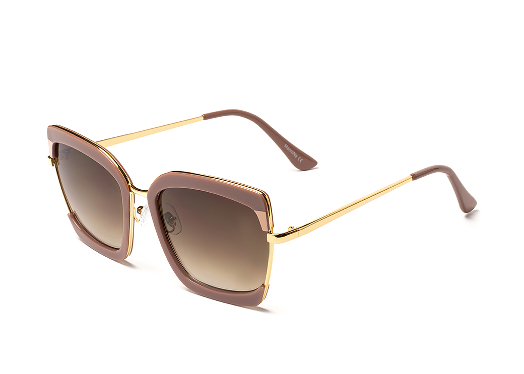 Okulary przeciwsłoneczne damskie o geometrycznym kształcie.Wykonane z plastiku w kolorze ecru, zauszniki metalowe.