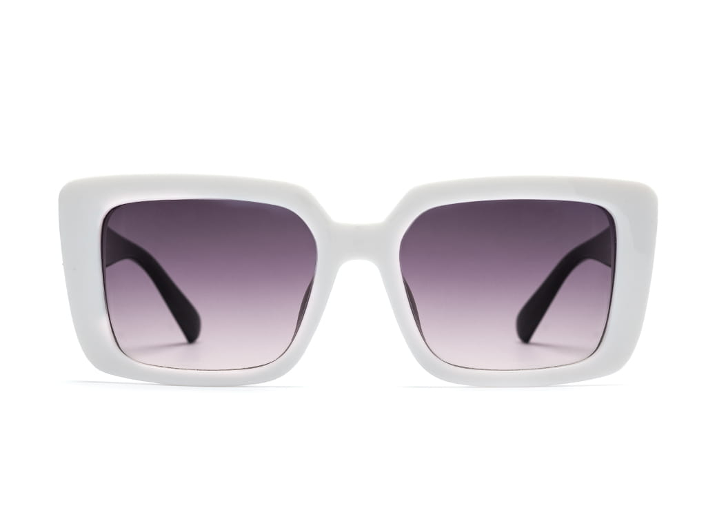 Klasyczne,prostokątne okulary przeciwsłoneczne w kolorze białym.Metalowe zdobienie na czarnym zauszniku