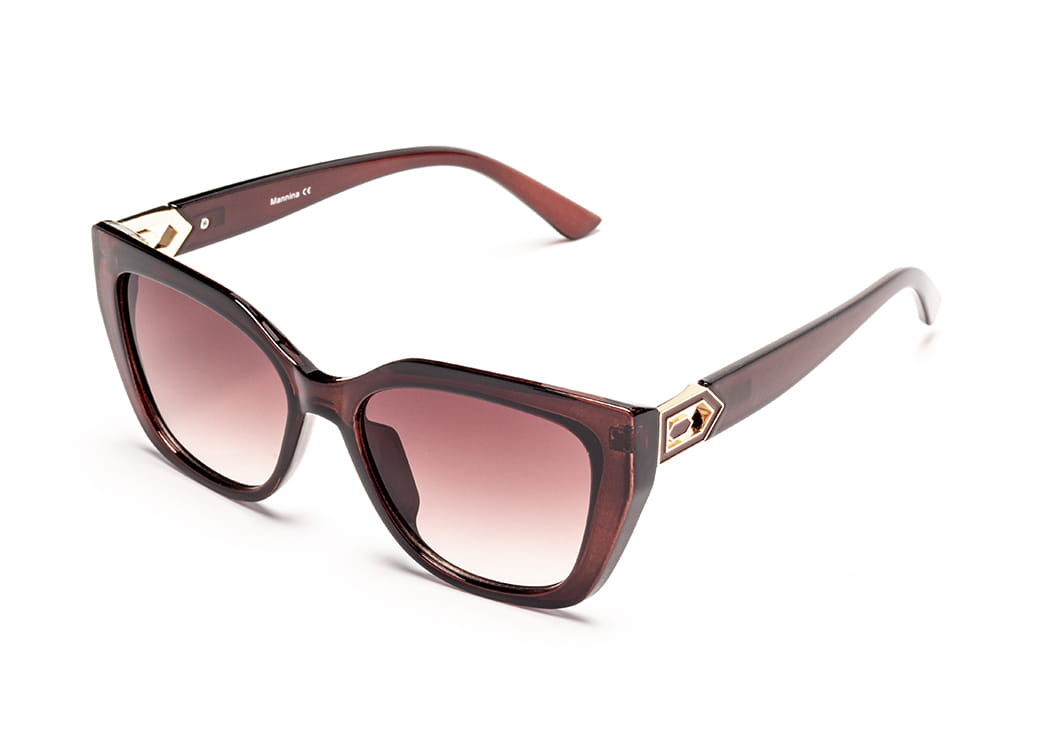 Klasyczne okulary przeciwsłoneczne o lekko geometrycznym kształcie w kolorze brązowym.Element dekoracyjny na zauszniku.