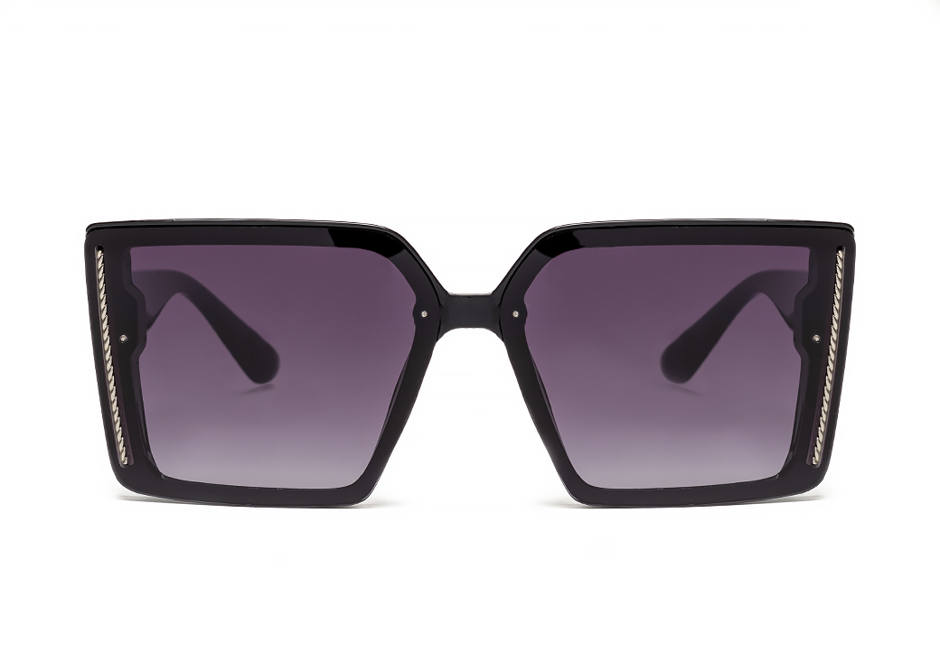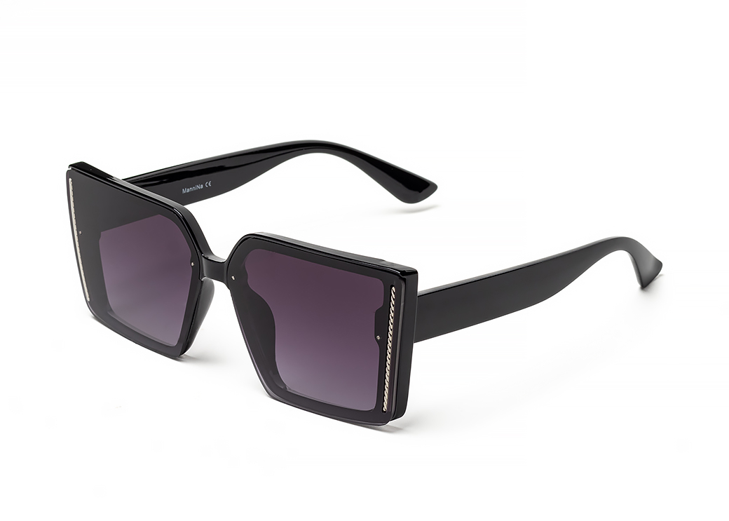 Duże,kwadratowe okulary przeciwsłoneczne w kolorze czarnym.Eleganckie zdobienie na froncie oprawki.