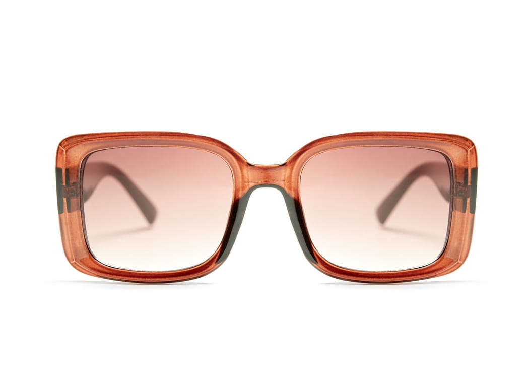 Klasyczne okulary przeciwsłoneczne w kolorze brązowym.Beżowy zausznik z elementem dekoracyjnym.