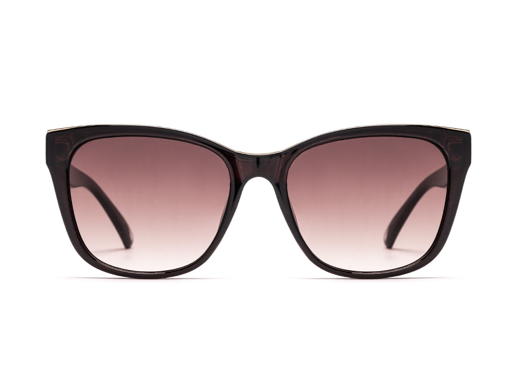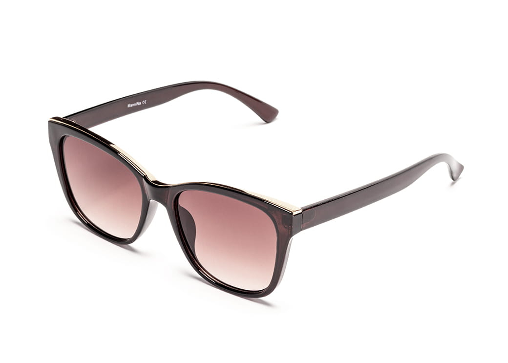 Klasyczne okulary przeciwsłoneczne w kolorze brązowym, delikatne metalowe zdobienie na górze oprawki.
