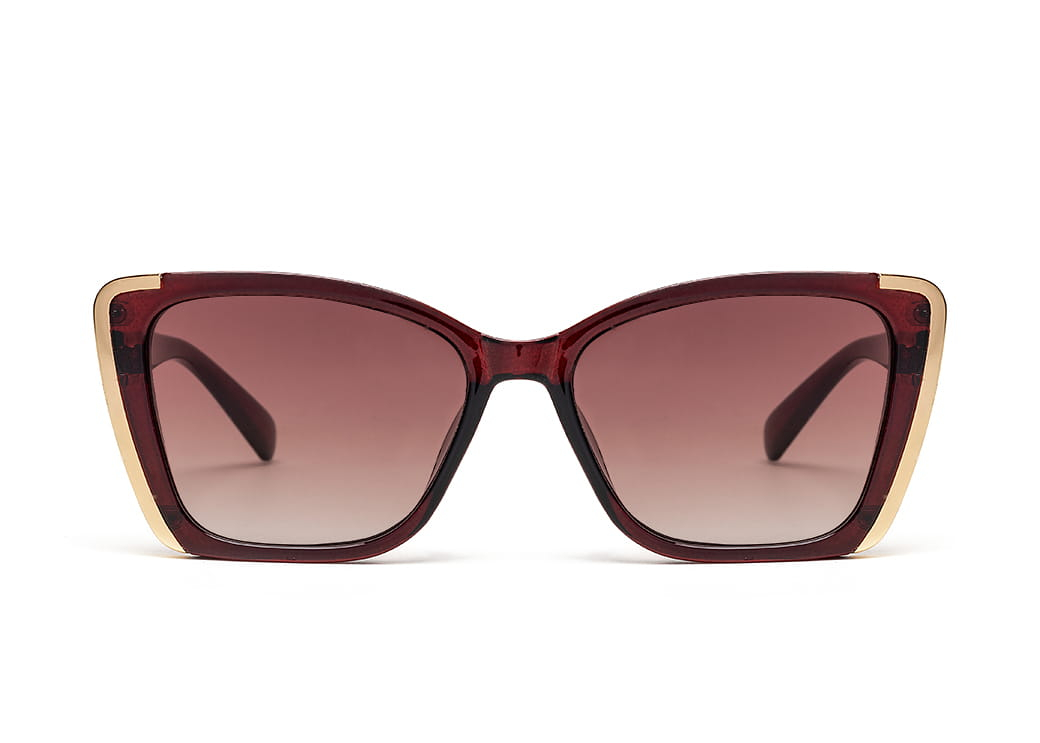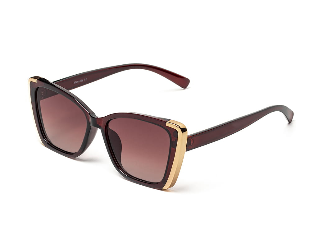 Okulary przeciwsłoneczne o kształcie "kocie oko" w kolorze brązowym.Złoty element dekoracyjny na froncie i boku oprawki.