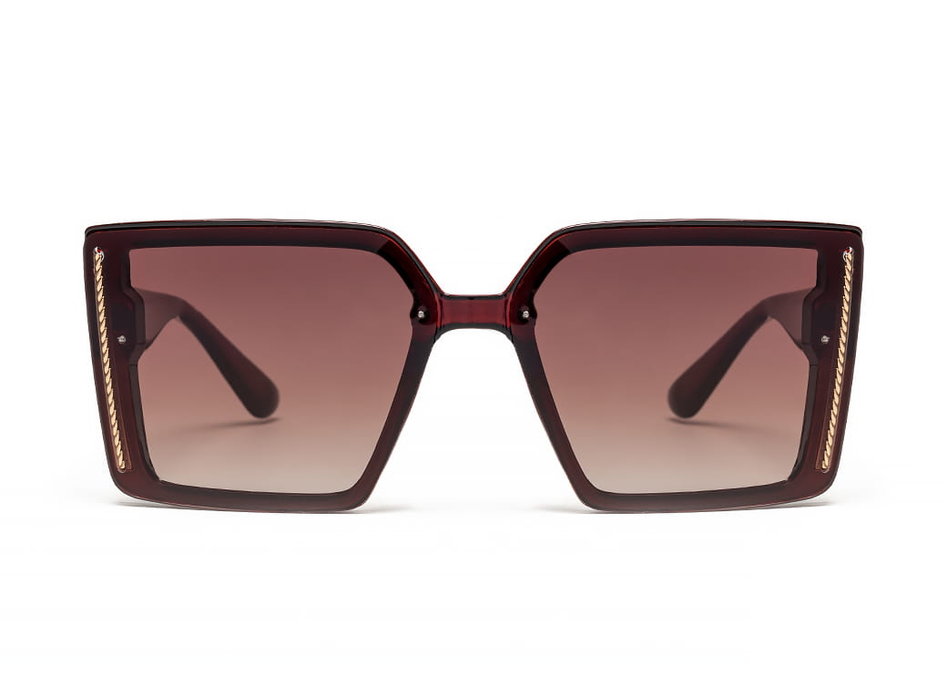 Duże,kwadratowe okulary przeciwsłoneczne z polaryzacją w kolorze brazowym.Eleganckie zdobienie na froncie oprawki.