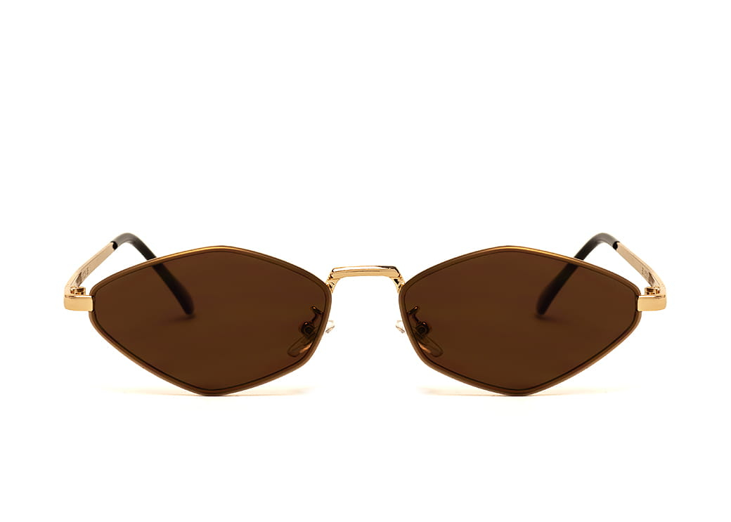 Okulary przeciwsłoneczne o geometrycznem kształcie, soczewka brązowa.