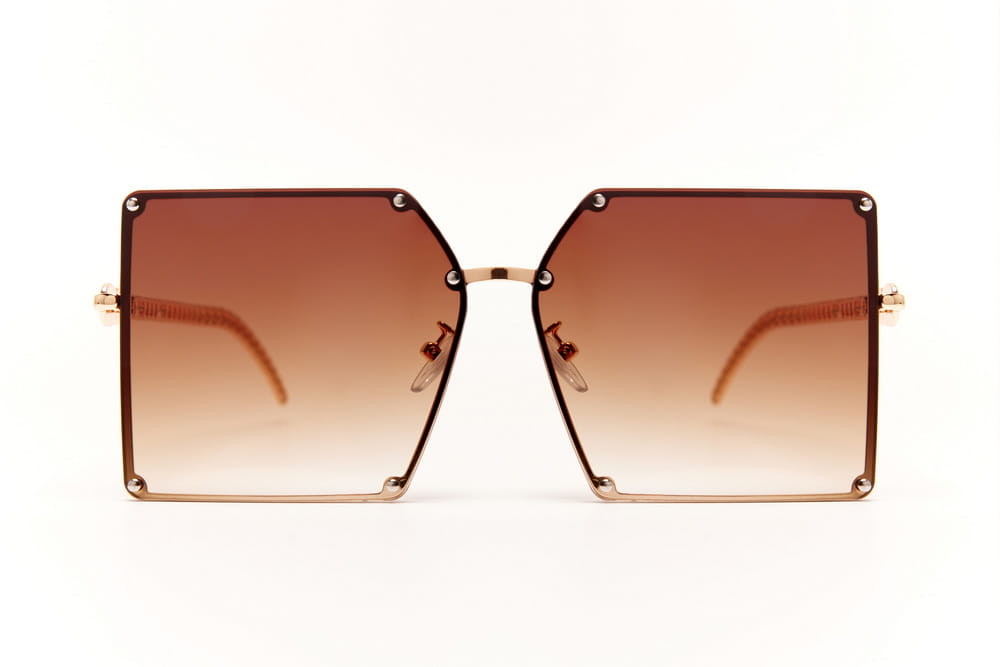Duże,kwadratowe okulary przeciwsłoneczne, soczewka brązowa.Elegancki,metalowy zausznik.