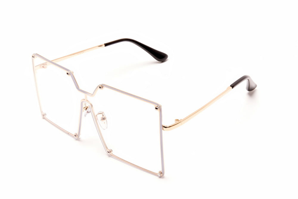 Duże,kwadratowe okulary zerówki, soczewka transparentna.Delikatny,metalowy zausznik.