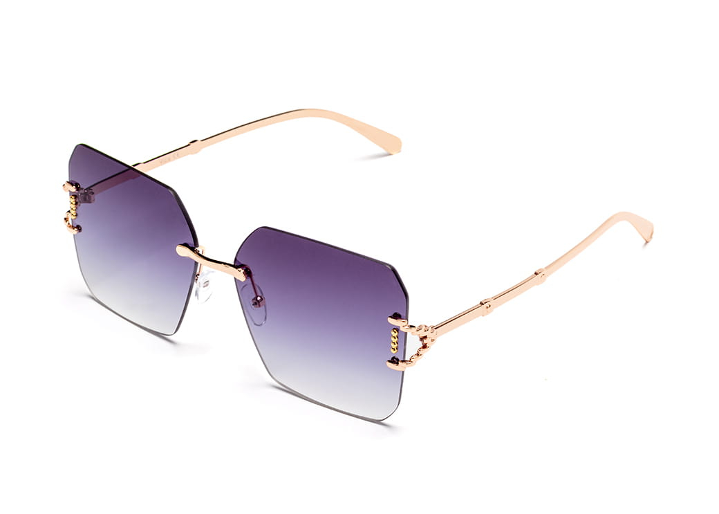 Duże,bezramkowe okulary przeciwsłoneczne, soczewka ciemnoszara.Elegancko zdobiony zausznik.