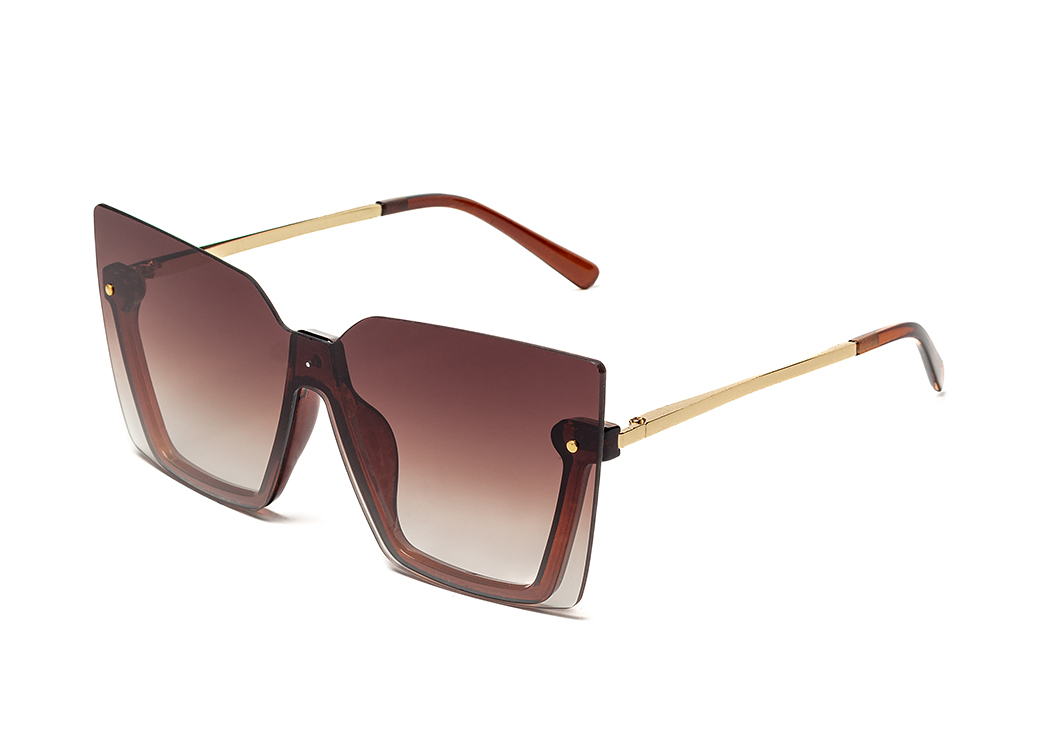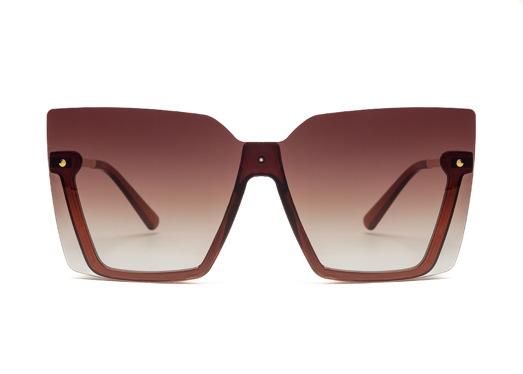 Duże,bezramkowe okulary przeciwsłoneczne z soczewką w kolorze brązowym.Delikatny metalowy zausznik.