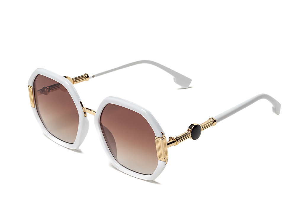 Duże okulary przeciwsłoneczne o geometrycznym kształcie w kolorze białym.Lekkie zdobienie na froncie oprawki i zauszniku.