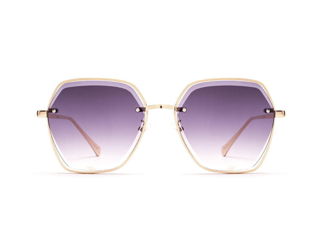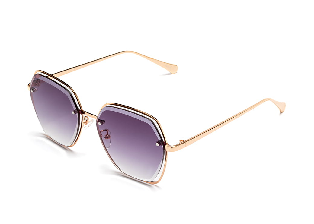 Okulary przeciwsłoneczne o geometrycznym kształcie z lekko szlifowaną, ciemnoszarą soczewką.