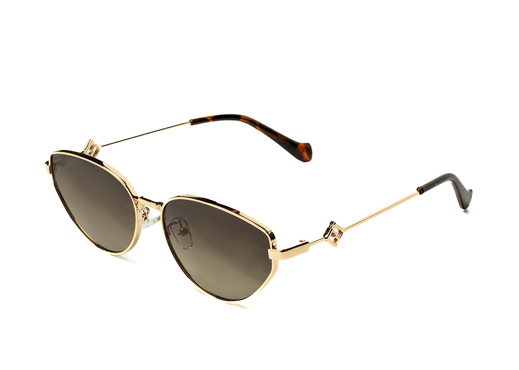 Metalowe okulary przeciwsłoneczne o nieregularnym kształcie,brązowa soczewka.Motyw dekoracyjny na zauszniku.