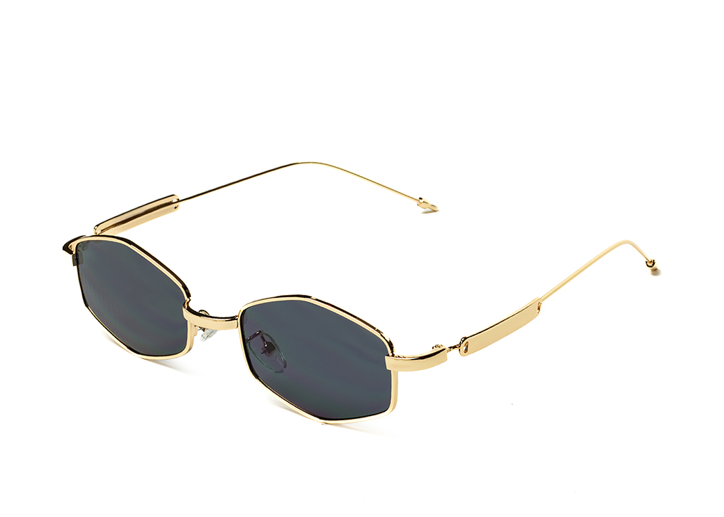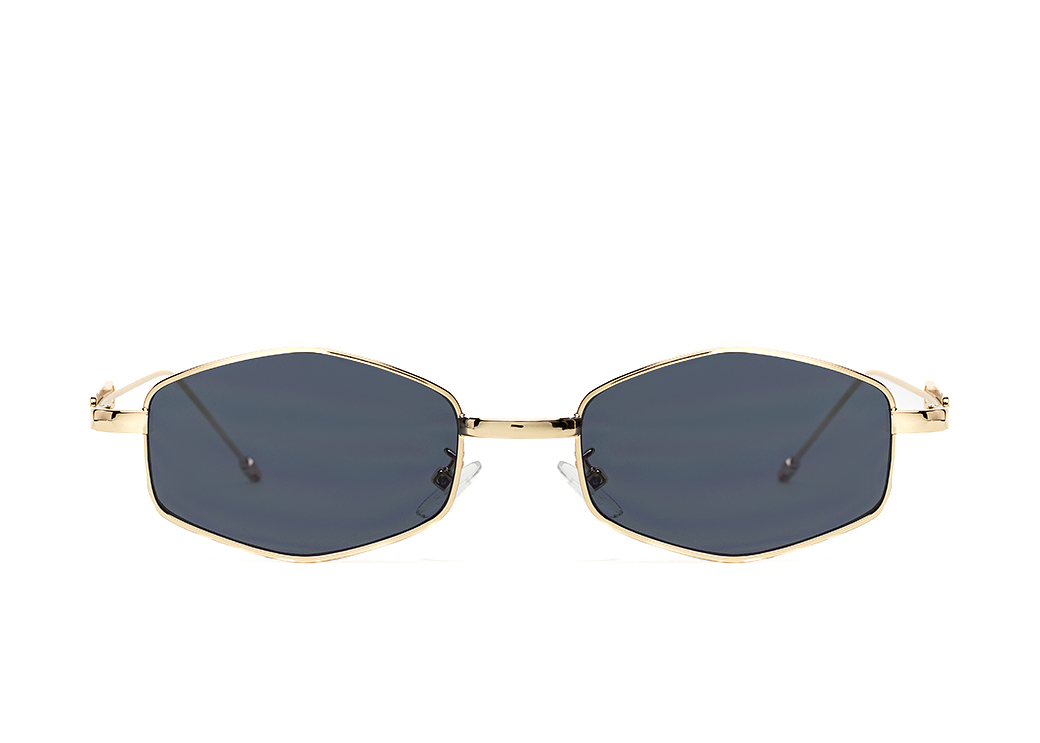 Okulary przeciwsłoneczne o geometrycznem kształcie,ciemnoszara soczewka, oryginalne metalowe zauszniki.