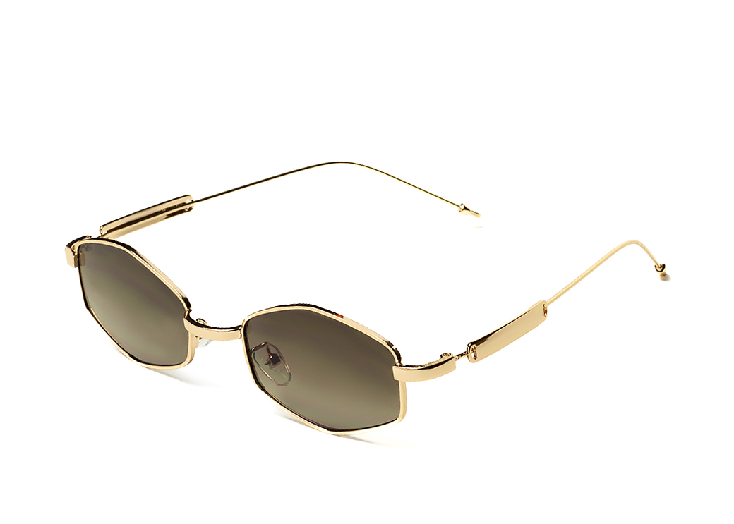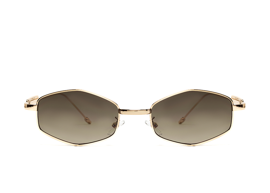Okulary przeciwsłoneczne o geometrycznem kształcie, brązowa soczewka, oryginalne metalowe zauszniki.