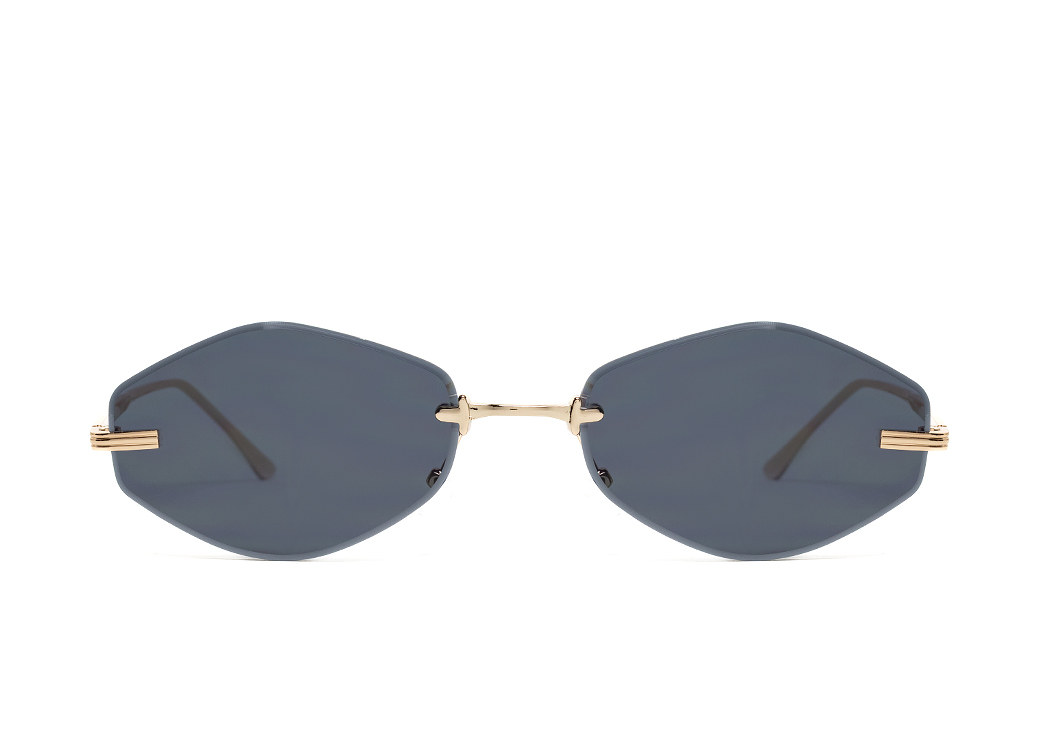 Małe bezbramkowe okulary o geometrycznym kształcie, ciemnoszara soczewka.Delikatne,metalowe zauszniki.