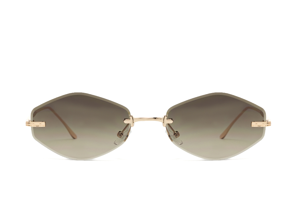 Małe bezbramkowe okulary o geometrycznym kształcie, brązowa soczewka.Delikatne,metalowe zauszniki.