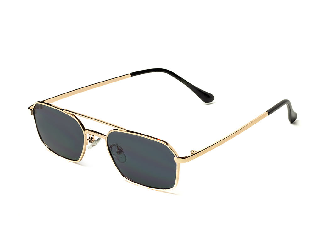 Małe okulary przeciwsłoneczne o geometrycznem kształcie,ciemnoszara soczewka.Delikatny,metalowy zausznik.