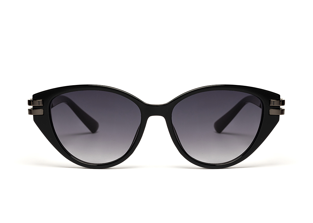 Oryginalne okulary przeciwsłonecznym w kolorze czarnym o kształcie "kocie oko".Metalowy element ozdobny łączący front oprawki z zausznikiem.