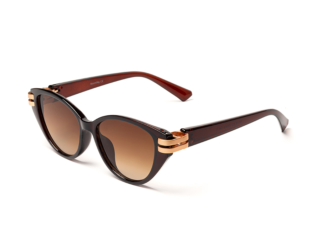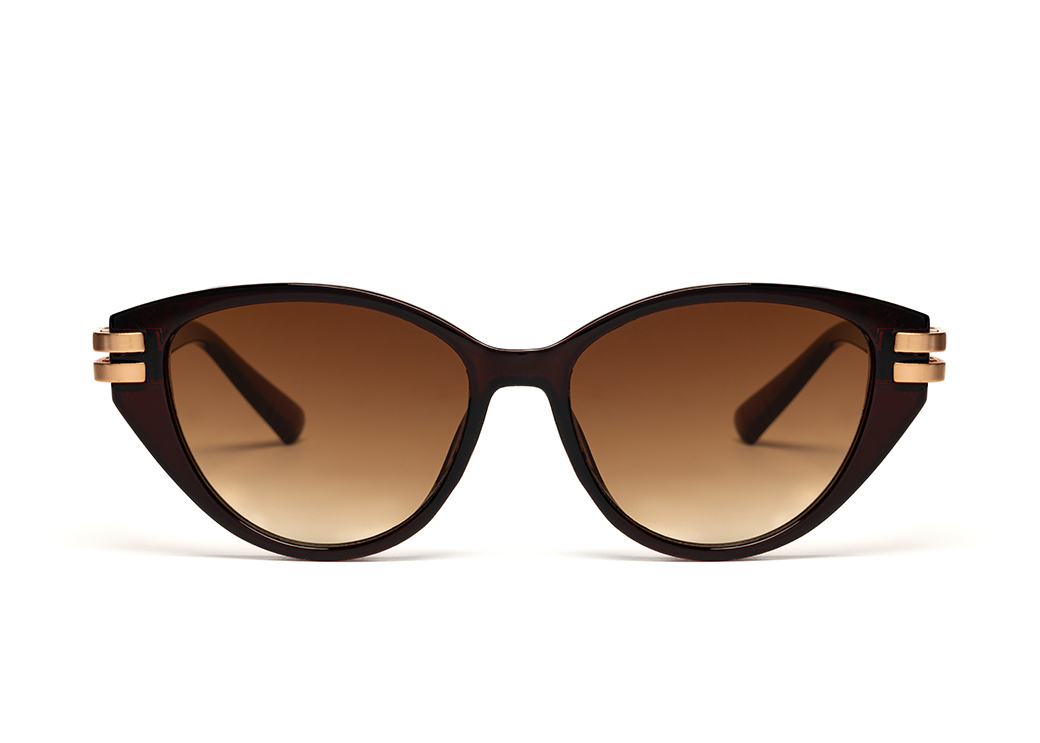 Oryginalne okulary przeciwsłonecznym w kolorze brązowym o kształcie "kocie oko".Metalowy element ozdobny łączący front oprawki z zausznikiem.