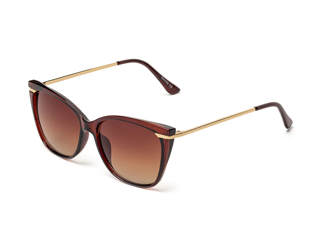 Okulary przeciwsłoneczne o kształcie "kocie oko" w kolorze brązowym.Delikatny,metalowy zausznik.