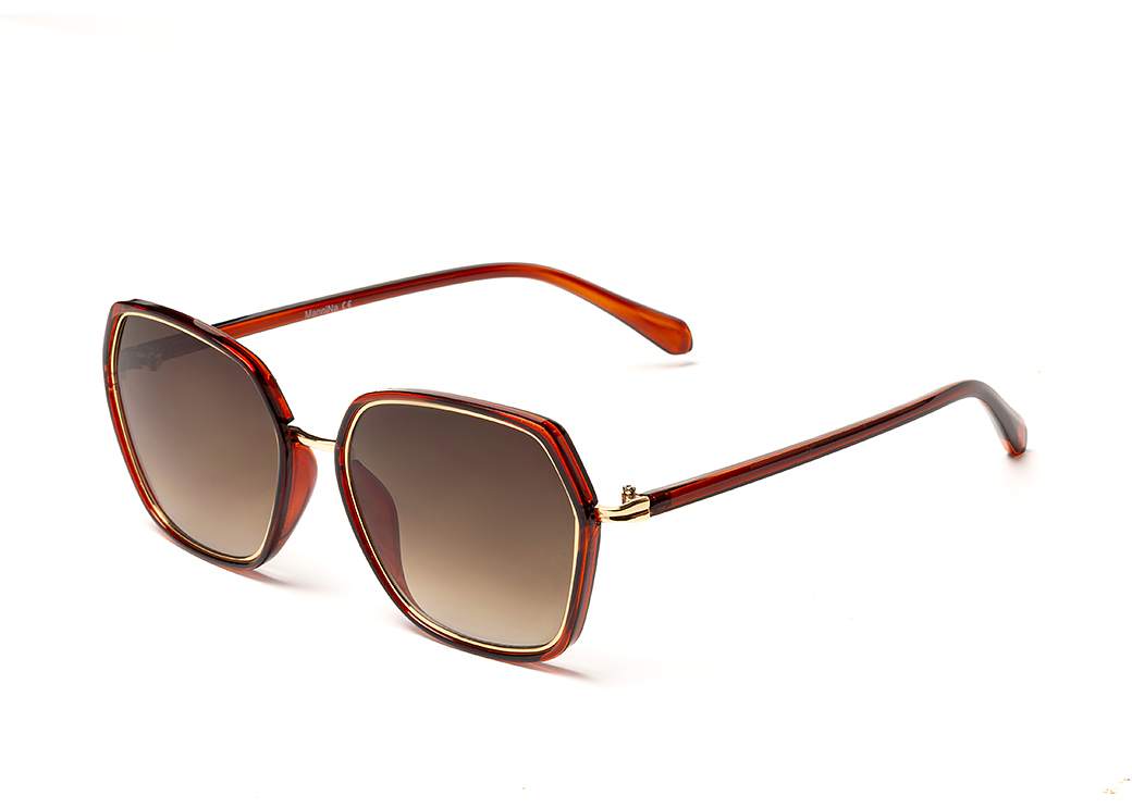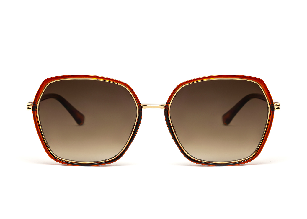 Okulary przeciwsłoneczne o geometrycznym kształcie w kolorze brązowym.Lekkie zdobienie wokół frontu oprawki.