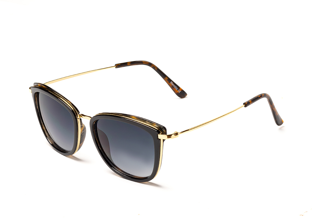 Klasyczne okulary przeciwsłoneczne w kolorze czarnym z górą oprawki w kolorze brąz panterka.Delikatne metalowe zauszniki w kolorze złotym.