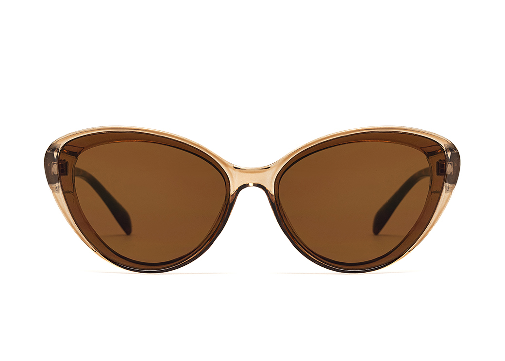 Okulary przeciwsłoneczne o kształcie "kocie oko" w kolorze beżowym.Zausznik w kolorze brąz panterka.