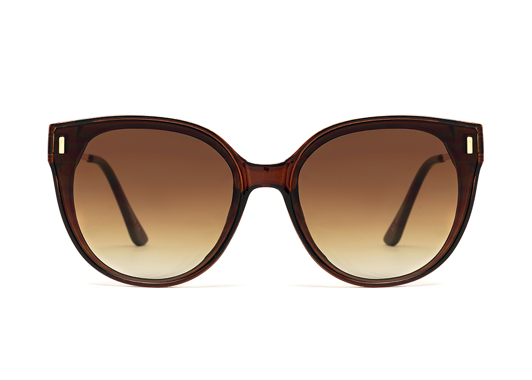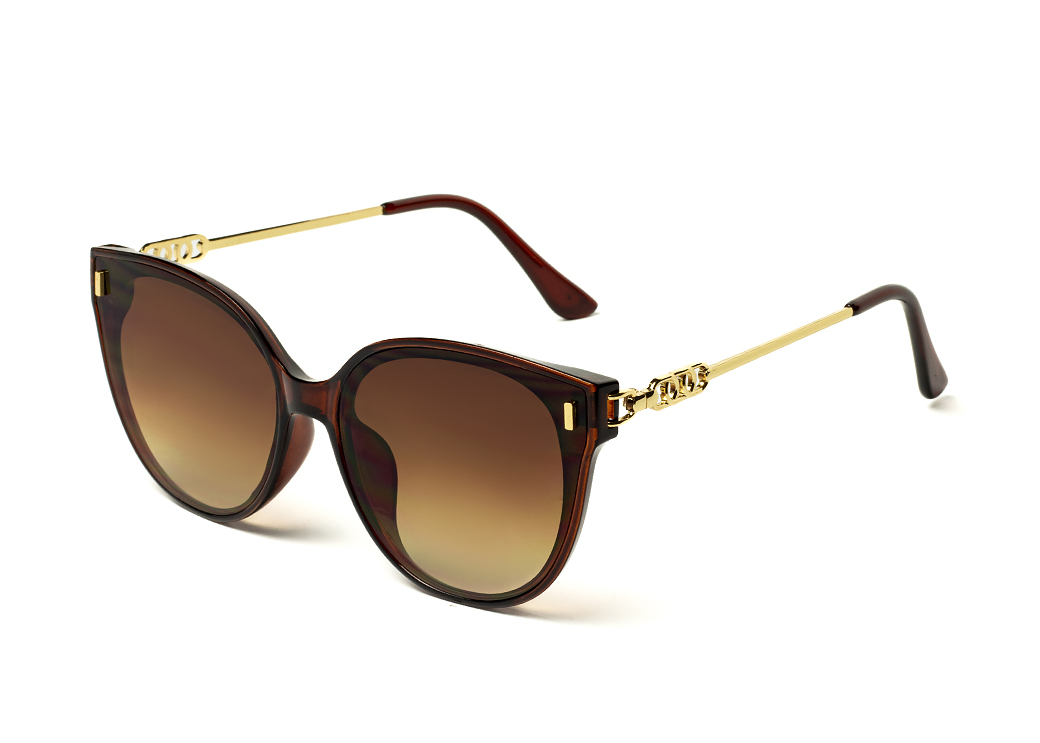 Okulary przeciwsłoneczne o lekko owalnym kształcie w kolorze brązowym.Metalowy zausznik z delikatnym zdobieniem.