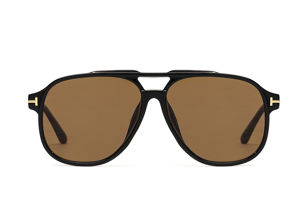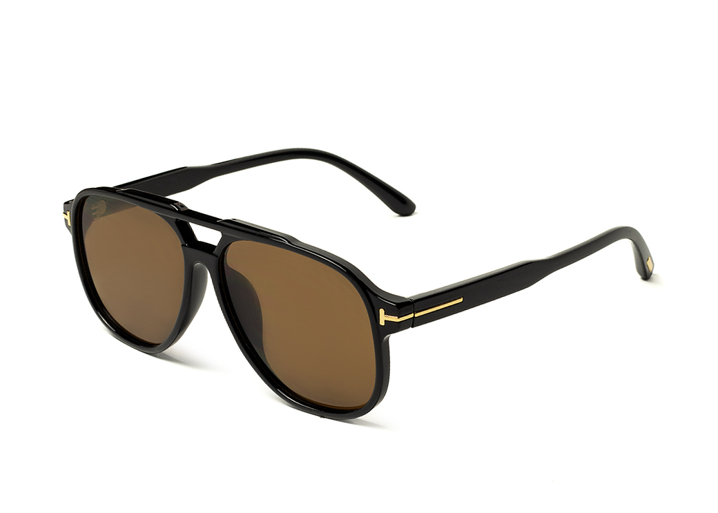 Okulary przeciwsłoneczne typu "aviator" w kolorze czarnym z brązową soczewką.Delikatny element dekoracyjny na zauszniku.