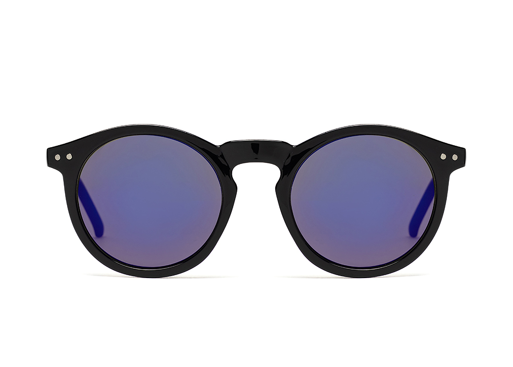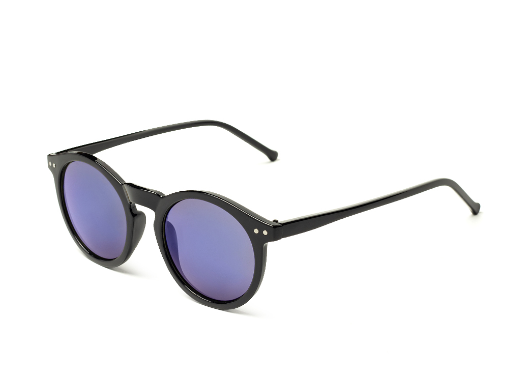 Małe,owalne okulary przeciwsłoneczne w kolorze czarnym,soczewka niebieska.