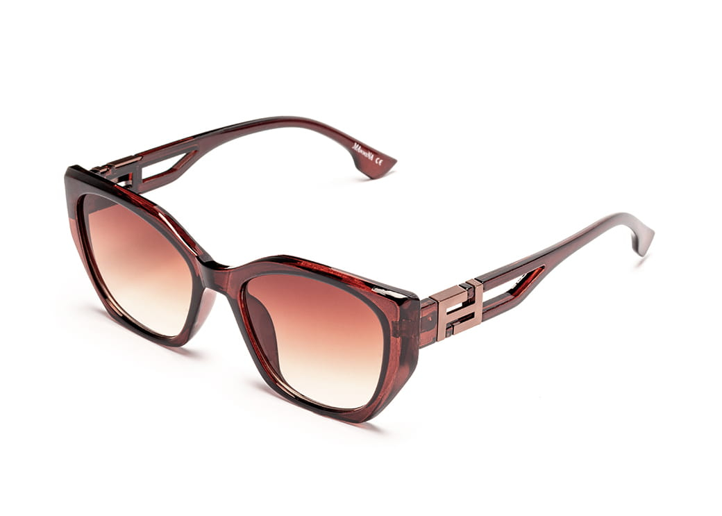 Okulary przeciwsłoneczne w kolorze brązowym o ciekawym, geometrycznym kształcie.Eleganckie zdobienie na zauszniku.
