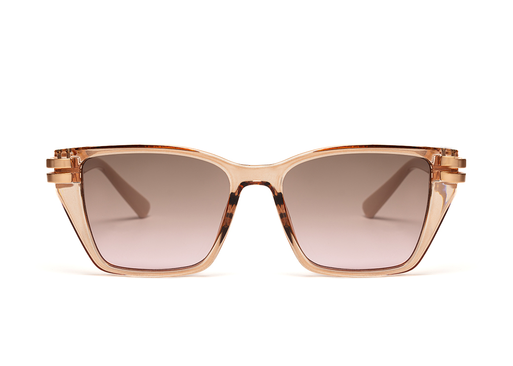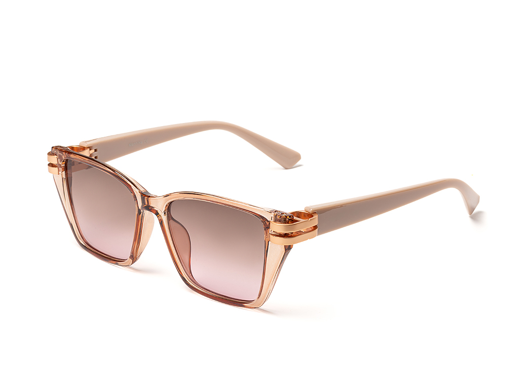 Klasyczne okulary przeciwsłoneczne w kolorze jasny róż.Metalowy element ozdobny łączący front oprawki z zausznikiem.
