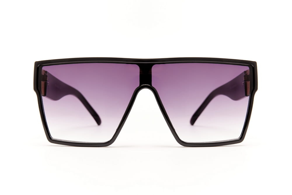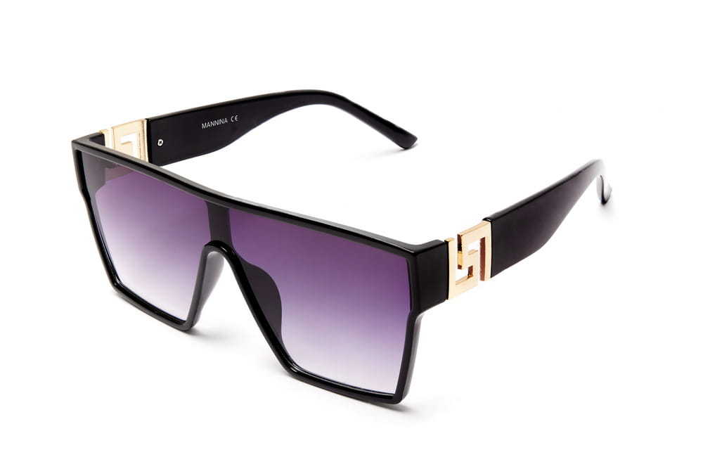 Duże okulary przeciwsłoneczne typu"maska"w kolorze czarnym.Eleganckie zdobienie na zauszniku.