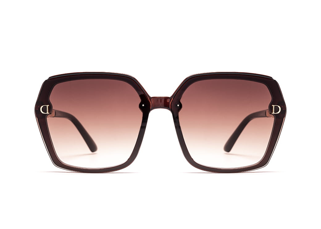 Okulary przeciwsłoneczne o geometrycznym kształcie w kolorze brązowym z lekkim zdobieniem na froncie oprawki.Elegancki,dekoracyjny zausznik.
