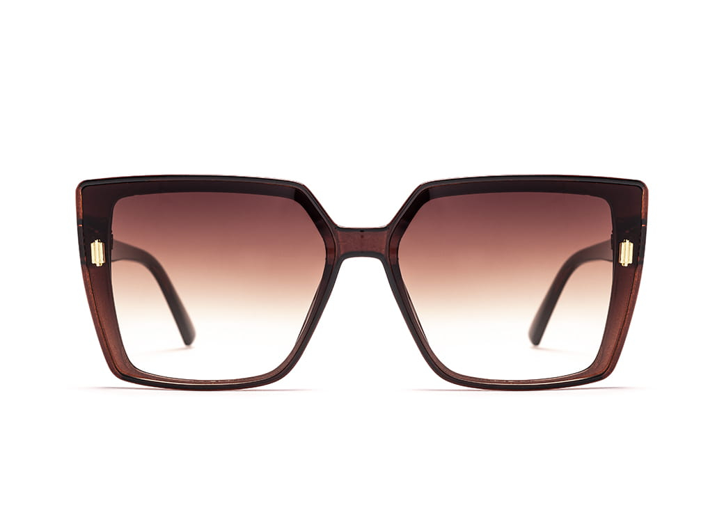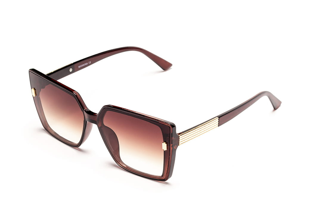 Klasyczne okulary przeciwsłoneczne w kolorze brązowym, lekkie zdobienie na froncie oprawki oraz na zauszniku.
