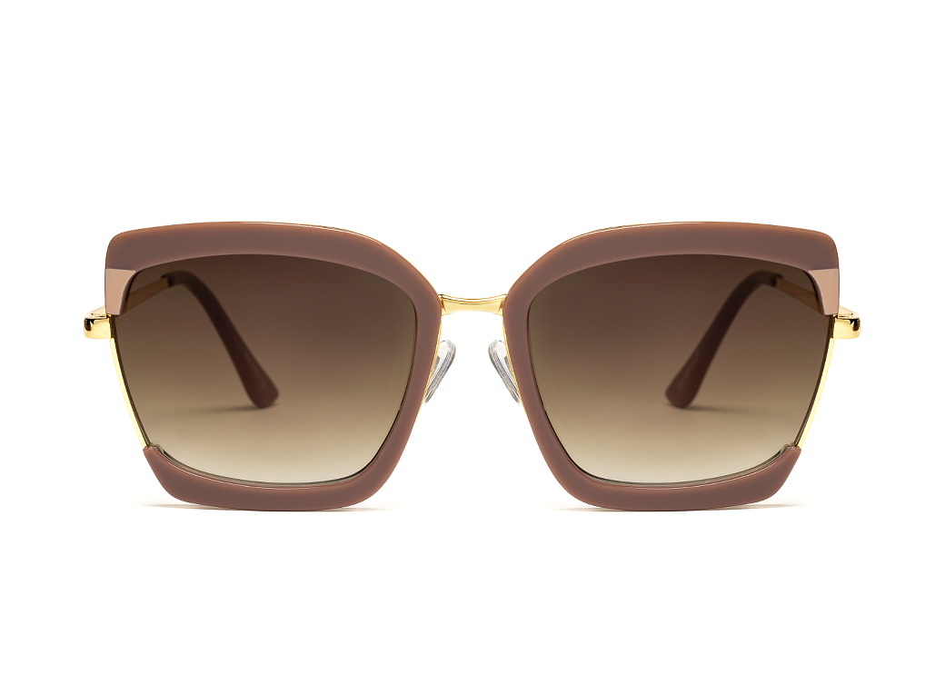 Okulary przeciwsłoneczne damskie o geometrycznym kształcie.Wykonane z plastiku w kolorze ecru, zauszniki metalowe.