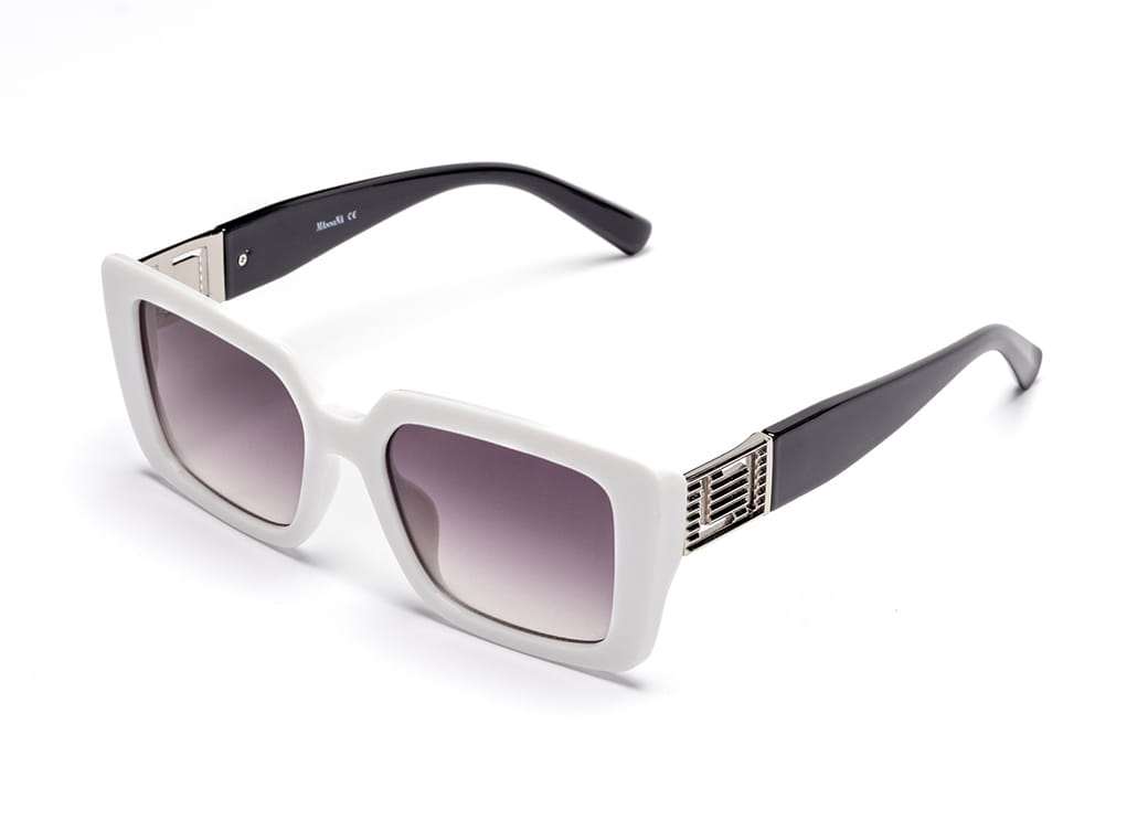 Klasyczne,prostokątne okulary przeciwsłoneczne w kolorze białym.Metalowe zdobienie na czarnym zauszniku