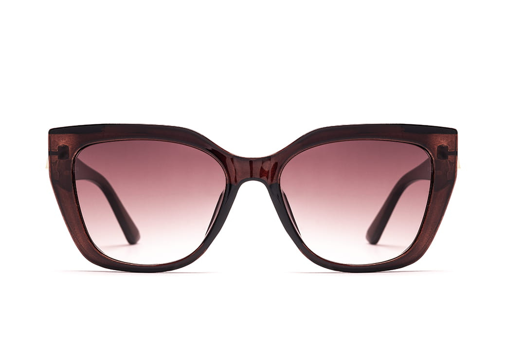 Klasyczne okulary przeciwsłoneczne o lekko geometrycznym kształcie w kolorze brązowym.Element dekoracyjny na zauszniku.