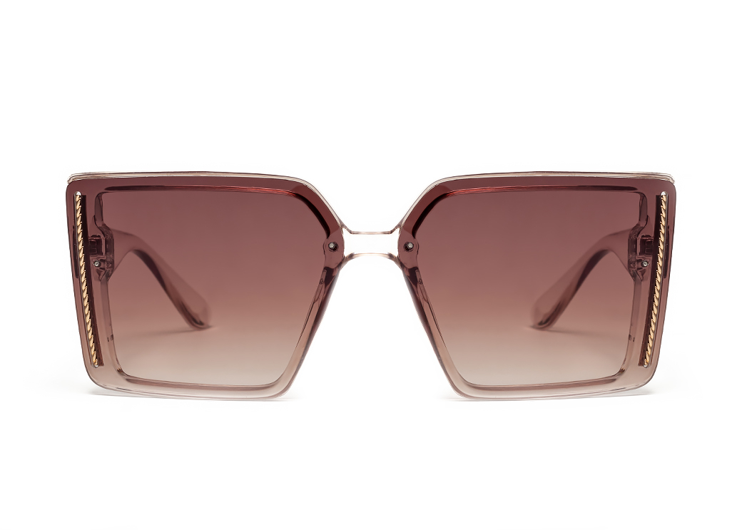 Duże,kwadratowe okulary przeciwsłoneczne w kolorze beżowym.Eleganckie zdobienie na froncie oprawki.
